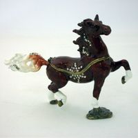 This jeweled "Prancing Horse" trinket is hinged for small treasures, such as your own necklace, pendant, or other small treasure. Like other Faberge type trinket holders this horse is encrusted with Swarovski crystals and vibrant enamel, which compliment the details of this adorable equestrian prize. Great as a gift, small trophy, or accent to any decor; this item is certain to be a prized possession for generations!