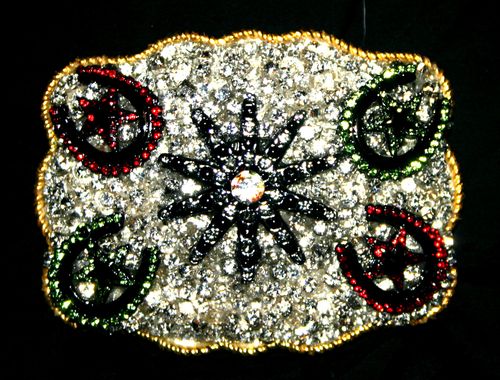 Layered & Layered & Layered! Large Rectangle jet spur rowell with 4 bright horse shoe and star combinations. Accent stones are jet and clear. 4 1/2" x 3 1/4"