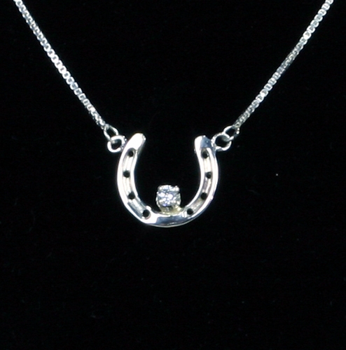 This awe inspiring luck filled lucky horse shoe is adorned with a center CZ. The Sterling silver lucky horseshoe measures 5/8" x 1/2" on a 17-1/2" 1mm sterling silver box chain .