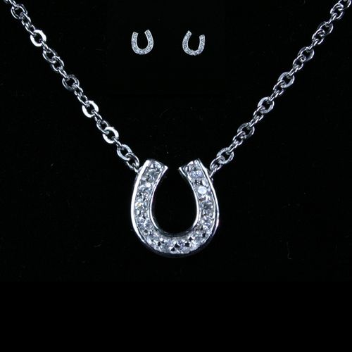 Go for a bit of glitz and glam with a pair of sterling silver horseshoe stud earrings covered with cubic zirconium stones and matching necklace. Earrings measure 3/8" by 3/8" and the necklace horseshoe pendant measures 3/4" x 5/8" covered with CZ's on a 17" 1mm Sterling silver box chain.