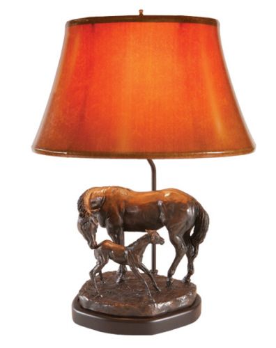 A lamp displaying the classic image of a mare and her new foal. Incredible and accurate detail is sculpted into this fine design by Nancy Weimer Belden for All Things Equine; produced and cast by OK Casting of furniture grade resin and a faux bronze finish. The sculpture dimensions are 8.5H X10L X 7D with an overall lamp height of 22".