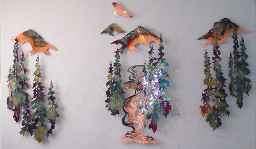 This art work titled "Altitude" offers in the left section evergreens and a mountain peak. The center offers an eagle in flight above a mountain peak, evergreens with a stream running through it. The right section offers a mountain peak above two stands of evergreens.
