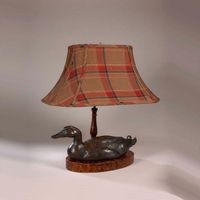 A 20" "Duck Lamp" for the duck hunter or duck lover in your life. Elegantly styled in a bronze finish of heavy resin and plaid linen shade. 3 way, 100 watt maximum bulb capacity. Hand made in the United States of America.