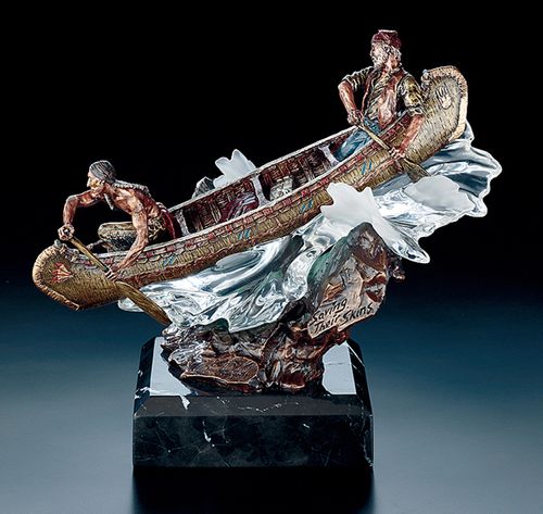 Shooting the rapids in acanoe has always been dangerous. This action packed mixed media sculpture displays the effort expended to stay upright. Limited Edition of 950 and 28" high by Christopher Pardell.