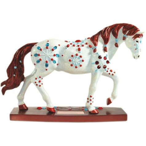 Some of the snowflake patterns on "Jewel" are accented with ruby and sapphire colored crystals. On a white Quarter Horse form with a red mane and tail, the resin figure measures 6". Each figurine has a metal plaque is embedded in the base, showing the horse's title and its exact serial number.